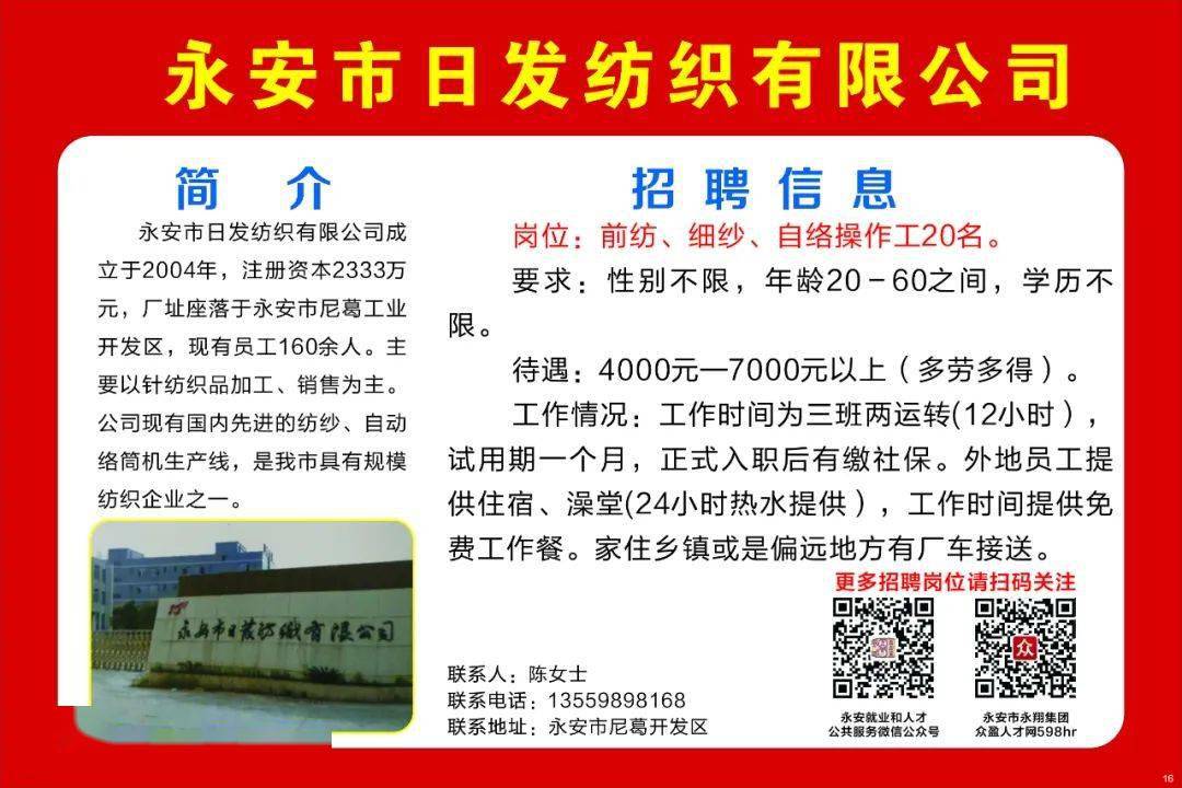 背景:随着浏阳永安地区制造业的快速发展,各类企业对于技术工人和生产管理人员的需求日益增加,为满足生产需求,各大企业正广泛发布招聘信息,诚邀广大求职者加入。